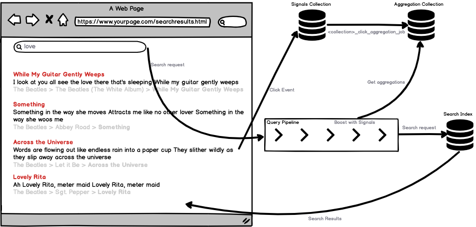 Relevance is the art of matching the user’s intent to content. In the end, we want to enable users to get the information they’re looking for as quickly as possible. Your search engine is capable of helping you with automatic relevancy boosting, but it needs information. By collecting signals from your users, something as simple as {"searchTerm=love, resultClicked="while my guitar gently weeps"}, you can find out what your users are looking for – and most importantly, what they click on. Armed with this information, your search engine can boost search results on its own.
